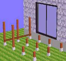 束を立てる 各束石の上に束を立てていきます。手摺のできる部分には長い方の束を立てて根がらみを止めておきます 根がらみの高さは出来上がりの床より、床板の厚み(38o)と大引きの高さ(89o)の分だけ下げて置いて下さい。 固定には内装ビスの長さ65o以上を各束に4本以上止めます。 あらかじめビスより小さい穴をあけておくと便利です。